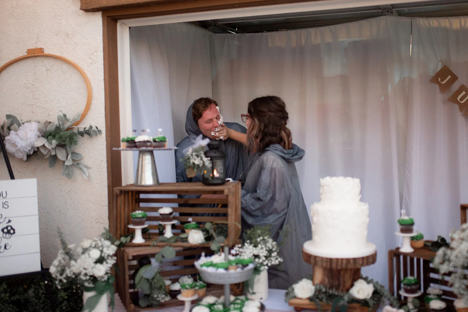 After a quick nap in the car, Emma and Makade were ready to celebrate up in Menifee at Emma’s mom’s house! Pulling up, you could smell the TACOS. When I asked Emma before the wedding what she was most looking forward to, she said quote “The tacos!” And boy was Emma right to be excited for the tacos. THEY WERE SO GOOD. haha. it wasn't just the tacos, but everything about the reception was so perfect for THEM. I love how everyone’s wedding identifies with them as a couple. I loved being able to see all of Emma and Makade’s friends and family gather around to share their love and support of their new union. They danced, talked and gave hugs to those who weren’t social distancing. Then they put rain ponchos on. We knew what was coming, and they did not disappoint. Cake EVERYWHERE. A quick shoe game, and a fake exit made the wrap to the perfect day.